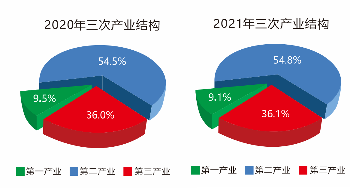 根据地区生产总值统一核算初步结果,2021年攀枝花市地区生产总值(GDP)1133.95亿元,按可比价格计算,比上年增长8.3%。其中,第一产业增加值103.56亿元,增长7.6%,对经济增长的贡献率为8.7%,拉动经济增长0.72个百分点;第二产业增加值621.48亿元,增长6.8%,对经济增长的贡献率为44.7%,拉动经济增长3.70个百分点;第三产业增加值408.91亿元,增长10.7%,对经济增长的贡献率为46.6%,拉动经济增长3.86个百分点。三次产业结构由上年的9.5:54.5:36.0调整为9.1:54.8:36.1。全市民营经济增加值585.70亿元,增长8.2%,占GDP的比重为51.7%,民营经济对经济增长的贡献率为51.1%。