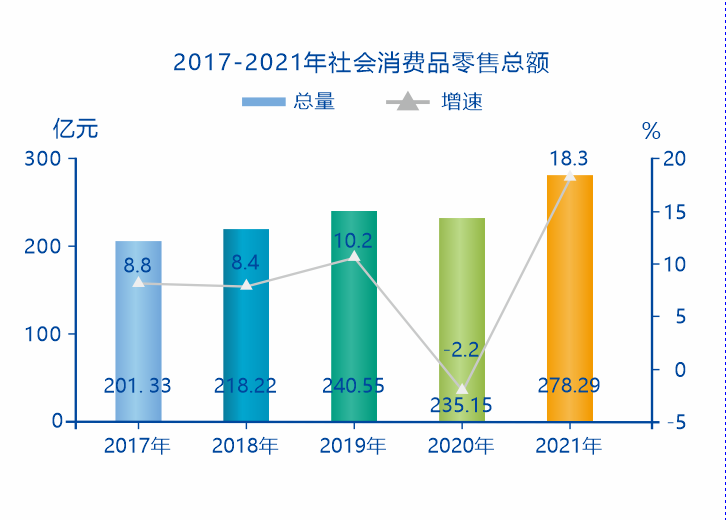 全年社会消费品零售总额278.29亿元,比上年增长18.3%。按经营地分,城镇消费品零售额253.90亿元,增长18.2%;乡村消费品零售额24.40亿元,增长19.6%。按消费形态分,商品零售236.54亿元,增长15.3%;餐饮收入41.76亿元,增长39.0%。