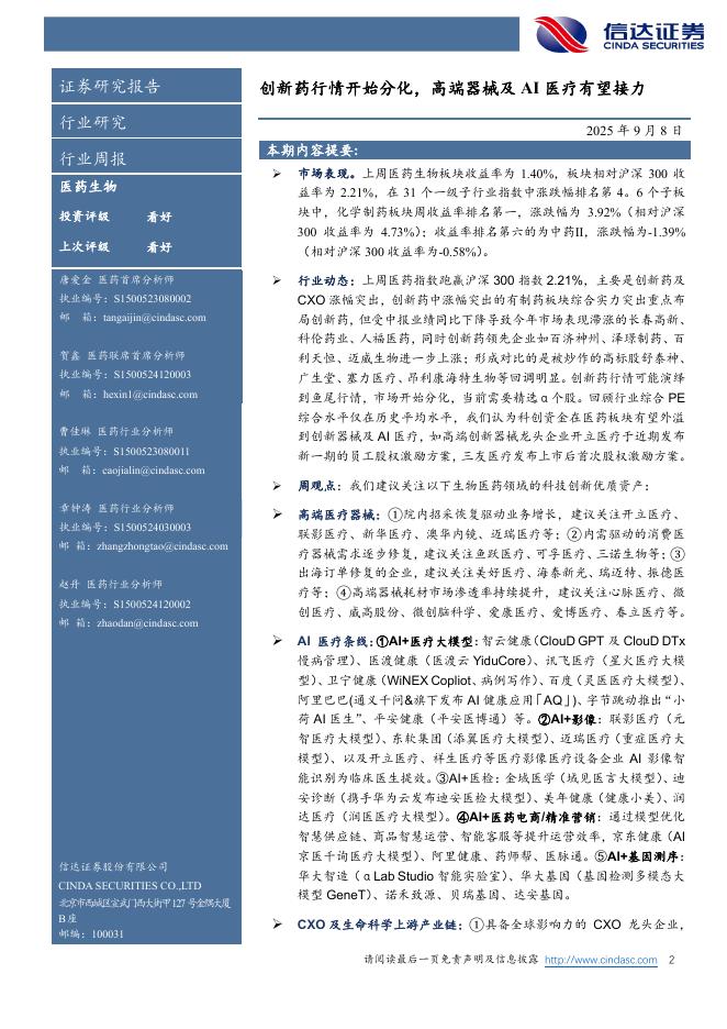 信达证券:医药生物行业周报:创新药行情开始分化,高端器械及AI医疗有望接力.pdf