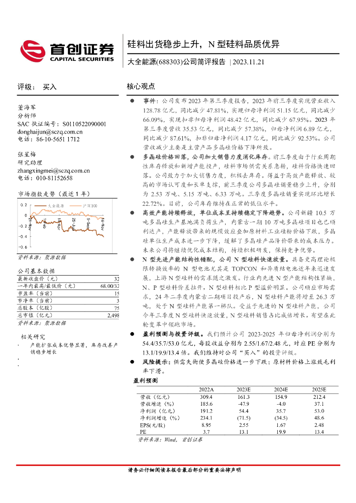 首创证券:大全能源(688303)-公司简评报告:硅料出货稳步上升,N型硅料品质优异.pdf