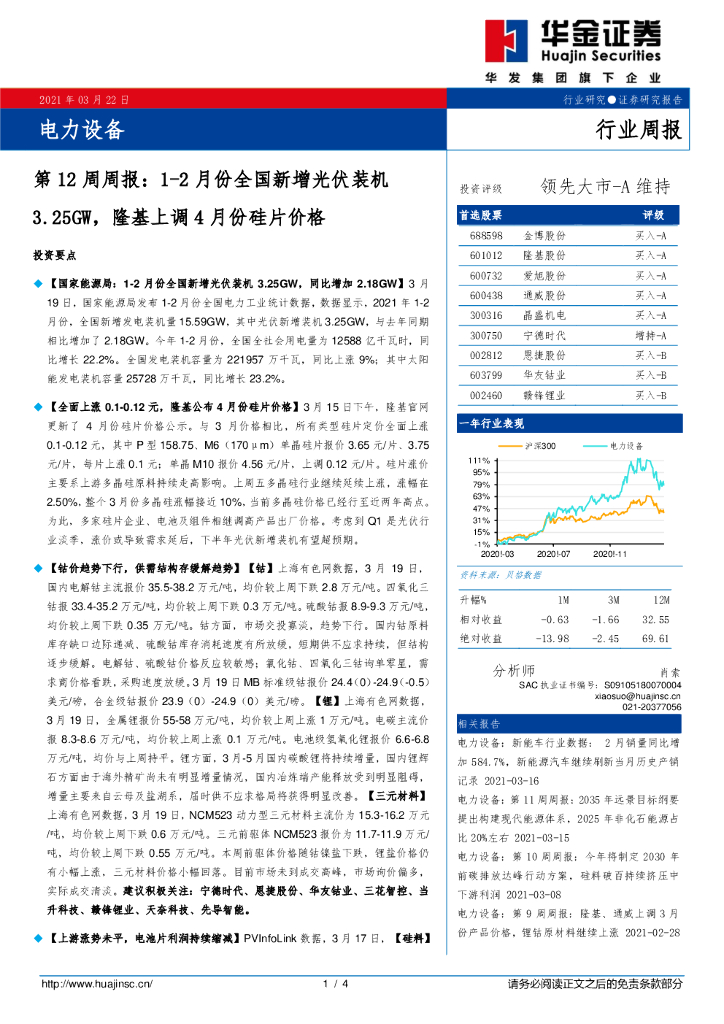 华金证券:电力设备第12周周报:1-2月份全国新增光伏装机3.25GW,隆基上调4月份硅片价格.pdf