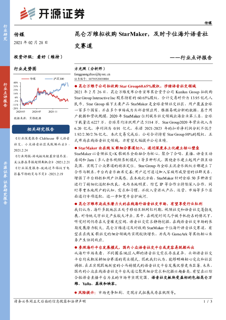开源证券:传媒行业点评报告:昆仑万维拟收购StarMaker,及时卡位海外语音社交赛道.pdf
