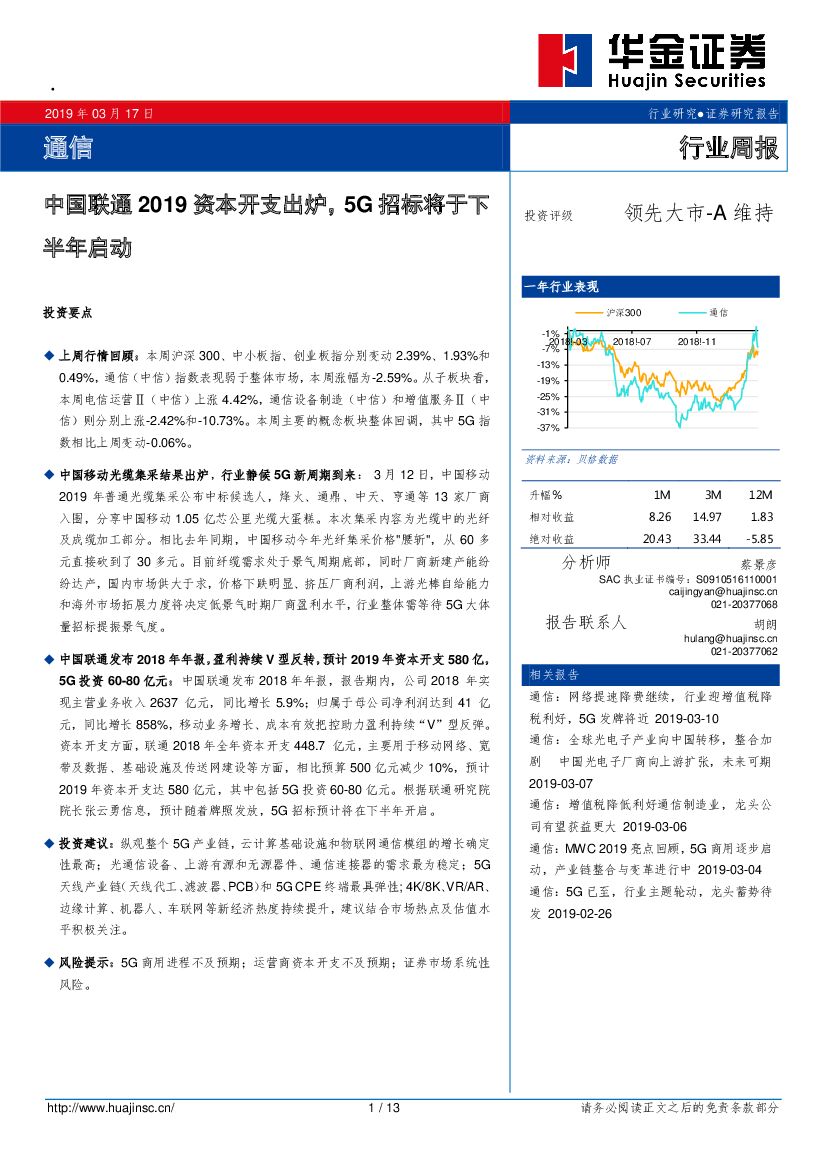 华金证券:通信行业周报:中国联通2019资本开支出炉,5G招标将于下半年启动.pdf