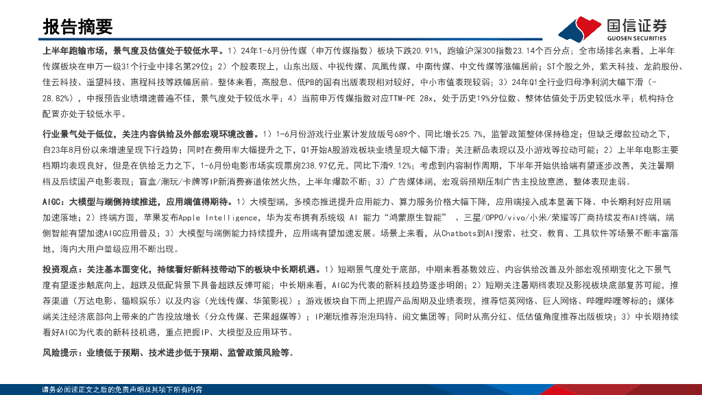 国信证券:传媒行业中期投资策略:短期景气低位,中长期关注AIGC等新科技进展.pdf