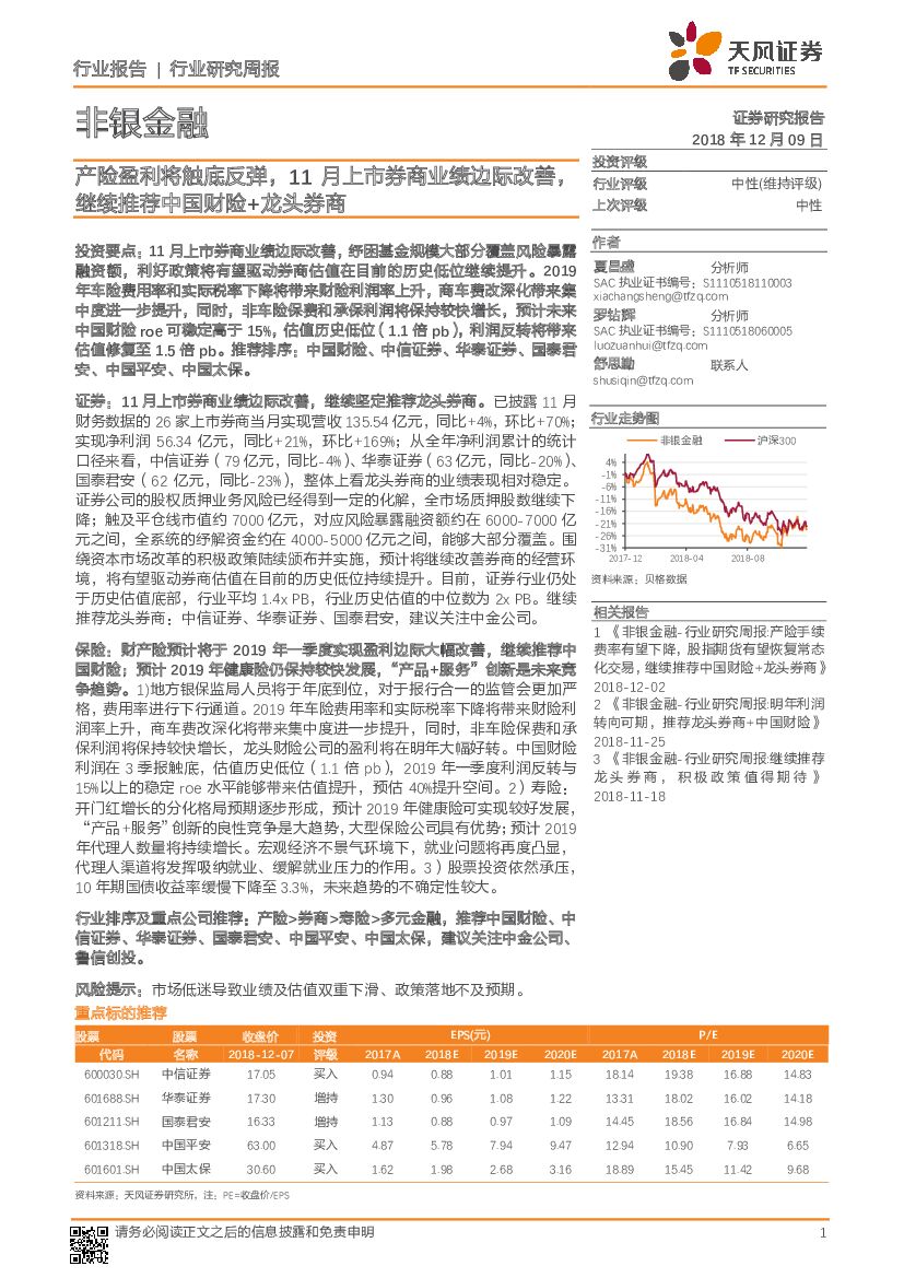 天风证券:非银金融行业研究周报:产险盈利将触底反弹,11月上市券商业绩边际改善,继续推荐中国财险+龙头券商.pdf