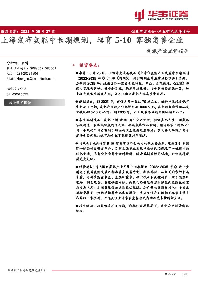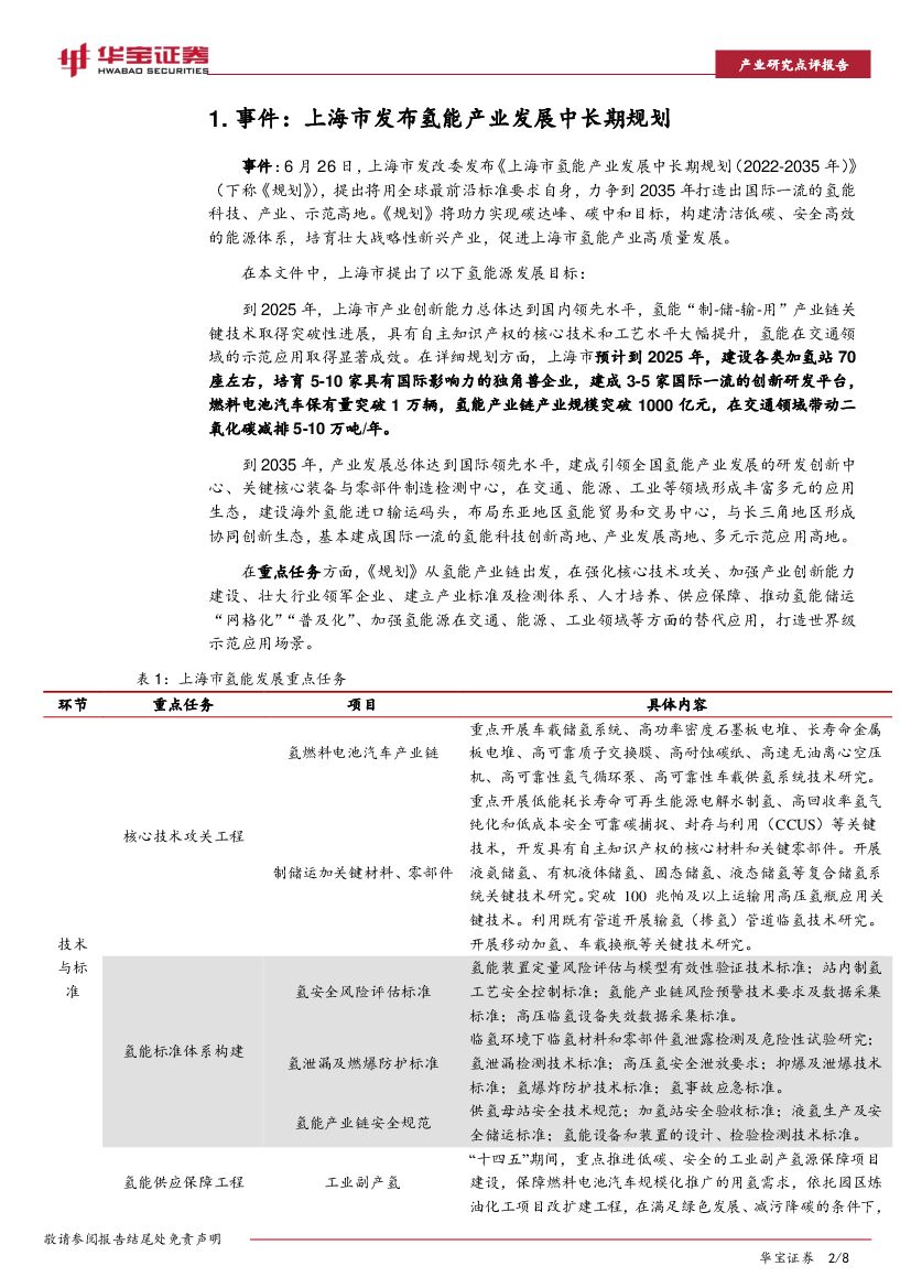 华宝证券:氢能产业点评报告:上海发布氢能中长期规划,培育5-10家独角兽企业.pdf