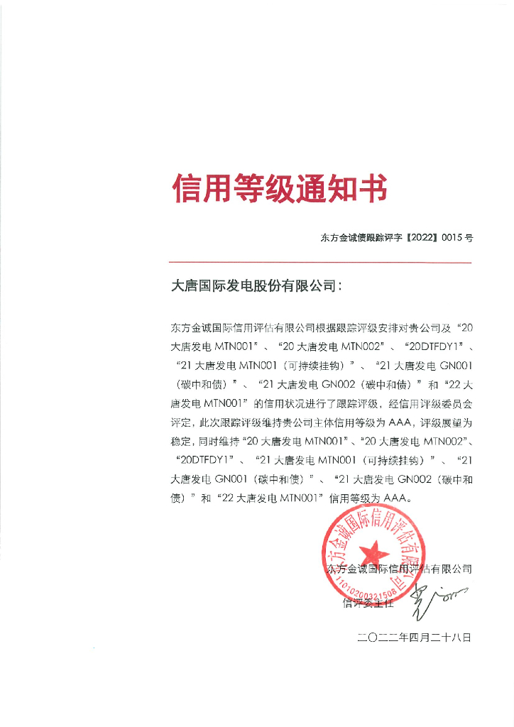 东方金诚:大唐国际发电股份有限公司主体及相关债项2022年度跟踪评级报告.pdf