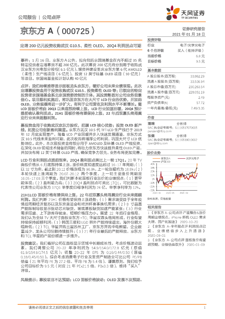 天风证券:京东方A(000725)-定增200亿元投资收购武汉G10.5、柔性OLED,20Q4利润拐点可期.pdf