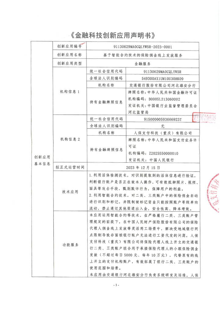 金融科技创新应用声明书:基于智能合约技术的保险佣金线上发放服务.pdf