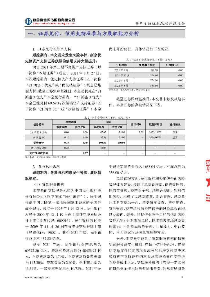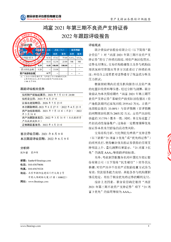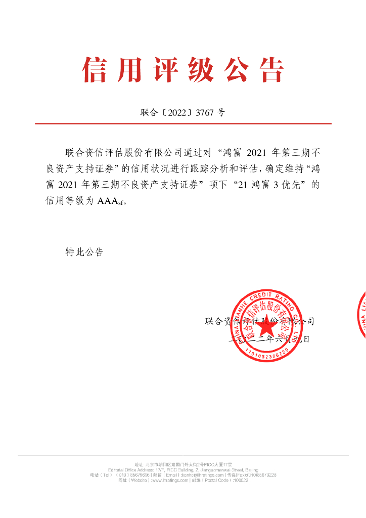 联合资信:鸿富2021年第三期不良资产支持证券2022年跟踪评级报告.pdf