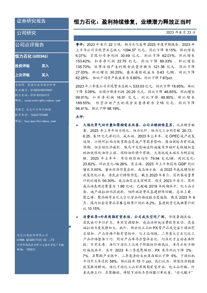 信达证券:恒力石化:盈利持续修复,业绩潜力释放正当时.pdf