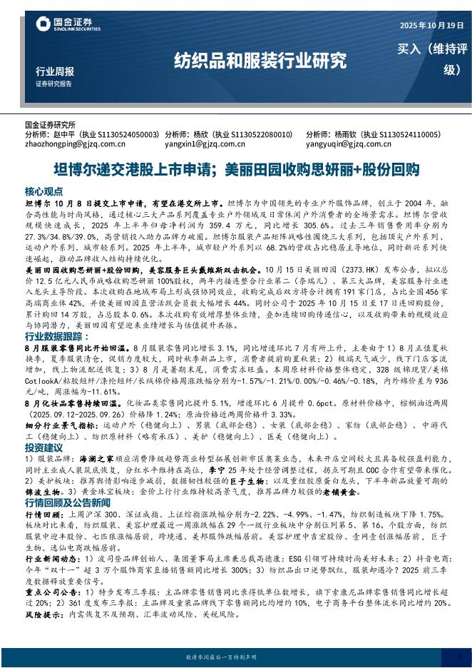 国金证券:纺织品和服装行业研究:坦博尔递交港股上市申请;美丽田园收购思妍丽+股份回购.pdf