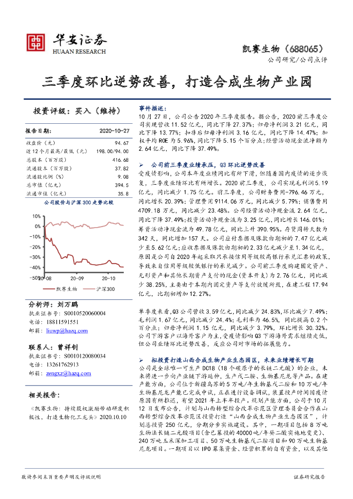 华安证券:凯赛生物(688065)-三季度环比逆势改善, 打造合成生物产业园.pdf
