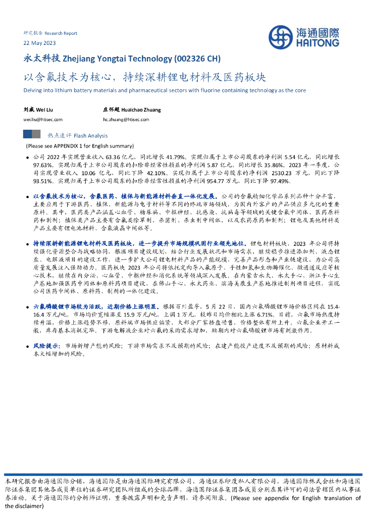 海通国际:永太科技(002326)-以含氟技术为核心,持续深耕锂电材料及医药板块.pdf