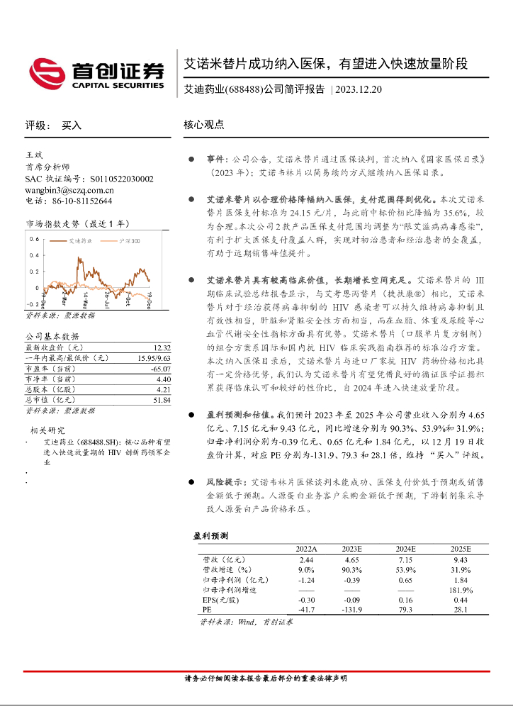 首创证券:艾迪药业(688488)-公司简评报告:艾诺米替片成功纳入医保,有望进入快速放量阶段.pdf