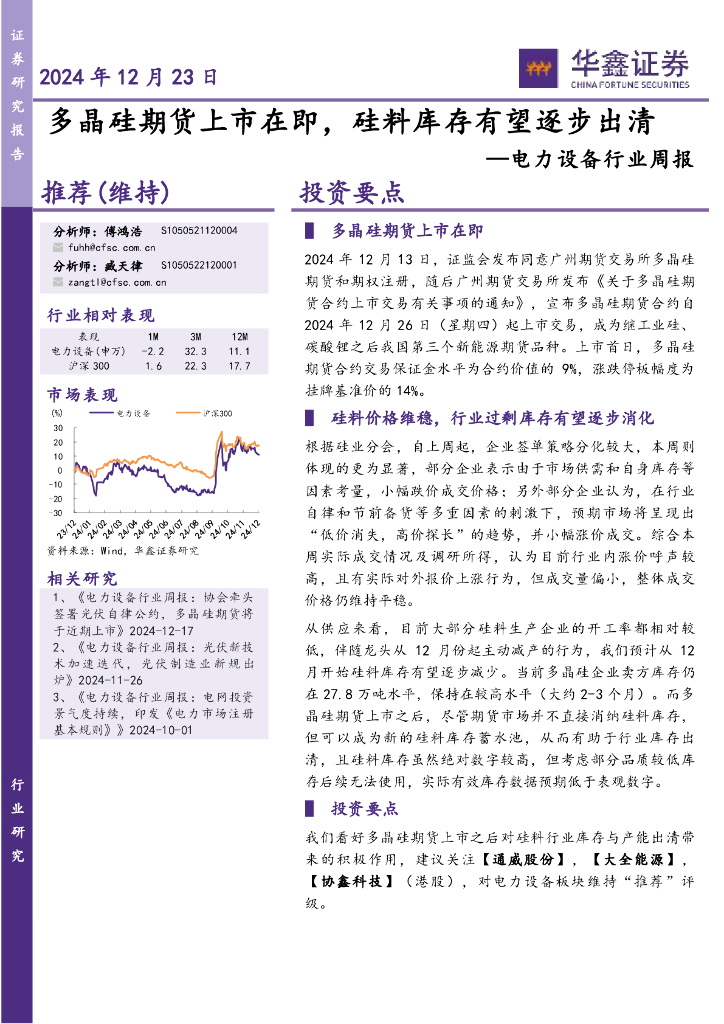 华鑫证券:电力设备行业周报:多晶硅期货上市在即,硅料库存有望逐步出清.pdf