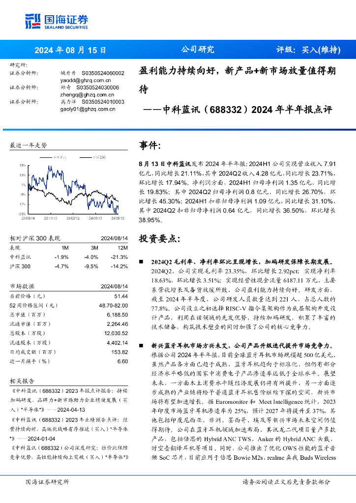 国海证券:中科蓝讯(688332)-2024年半年报点评:盈利能力持续向好,新产品+新市场放量值得期待.pdf