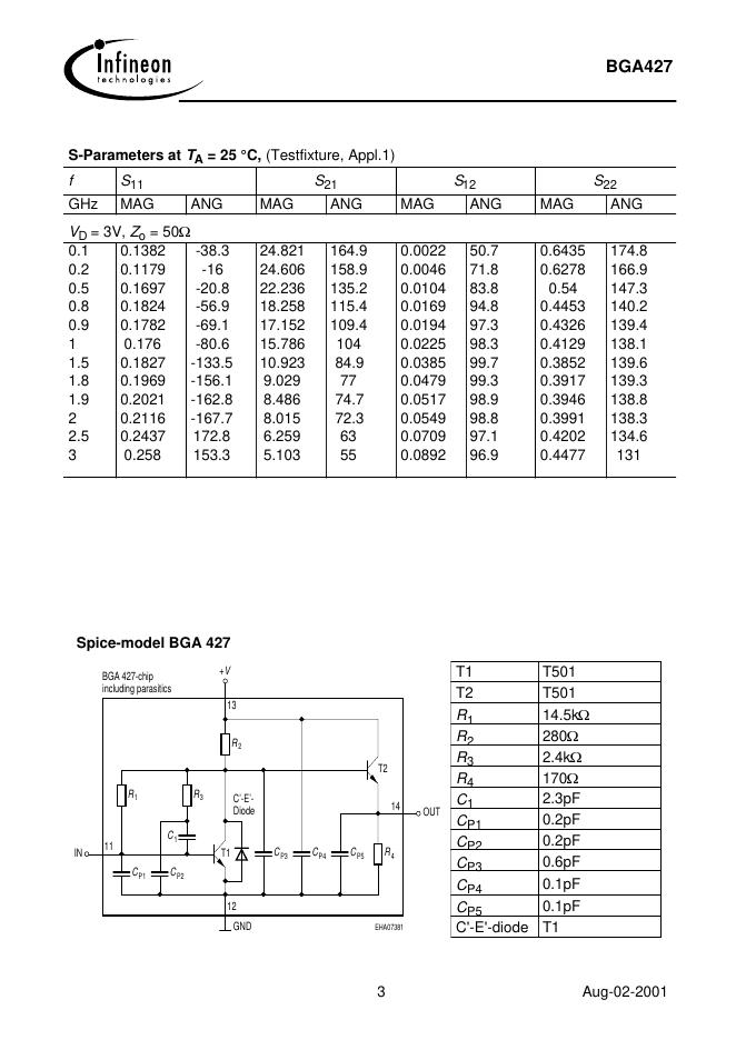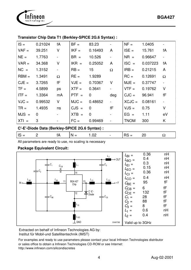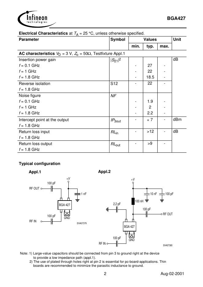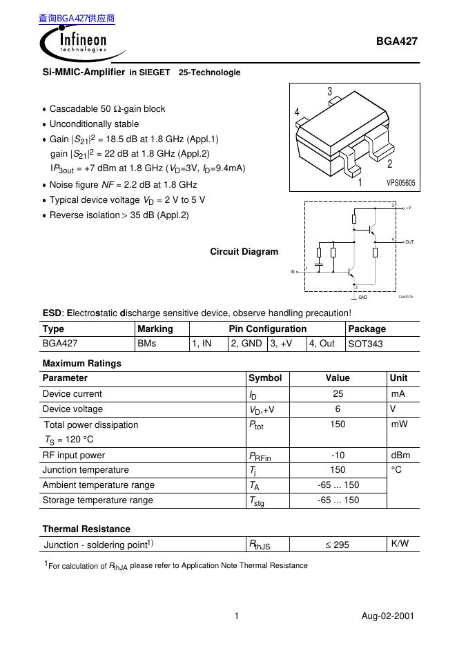 lnfineon BGA427 Si-MMIC-Amplifier in SIEGET 25-Technologie 数据手册.pdf