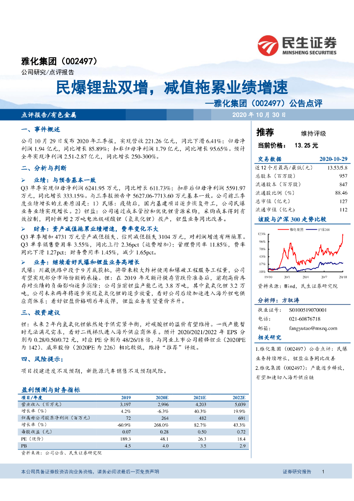 民生证券:雅化集团(002497)-公告点评:民爆锂盐双增,减值拖累业绩增速.pdf