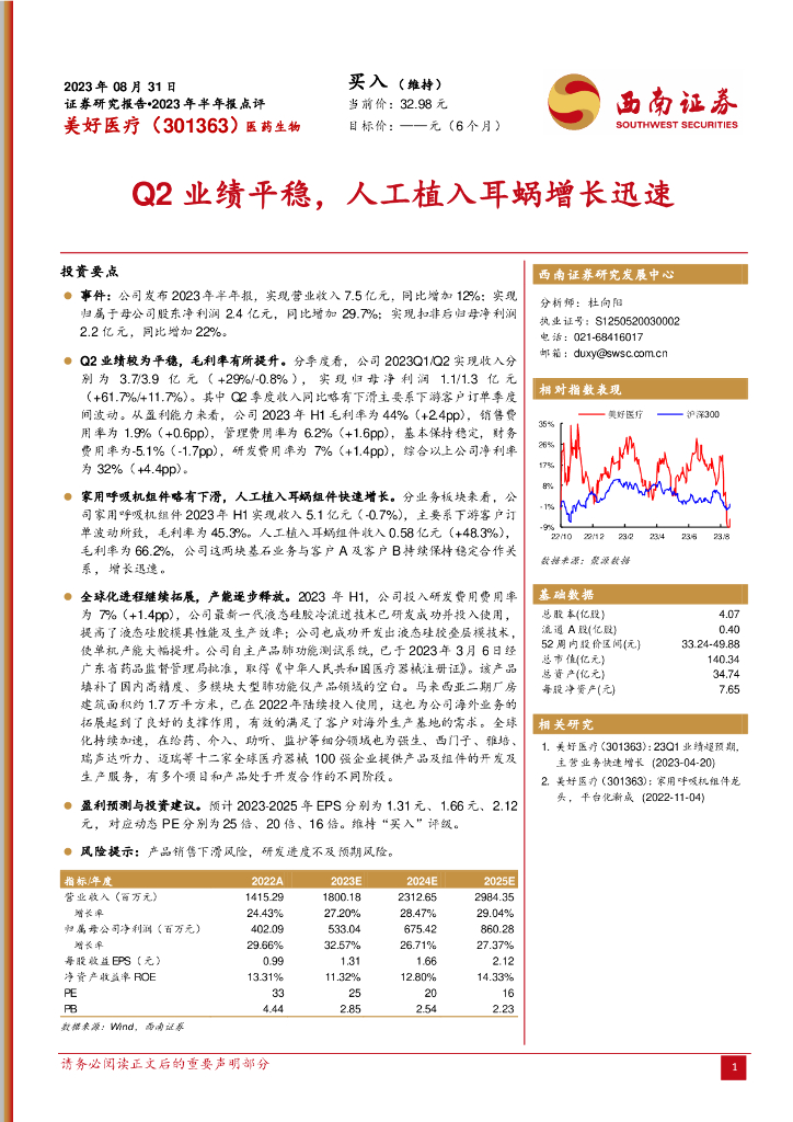 西南证券:美好医疗(301363)-Q2业绩平稳,人工植入耳蜗增长迅速.pdf