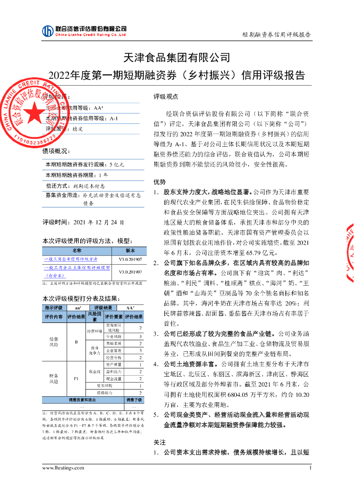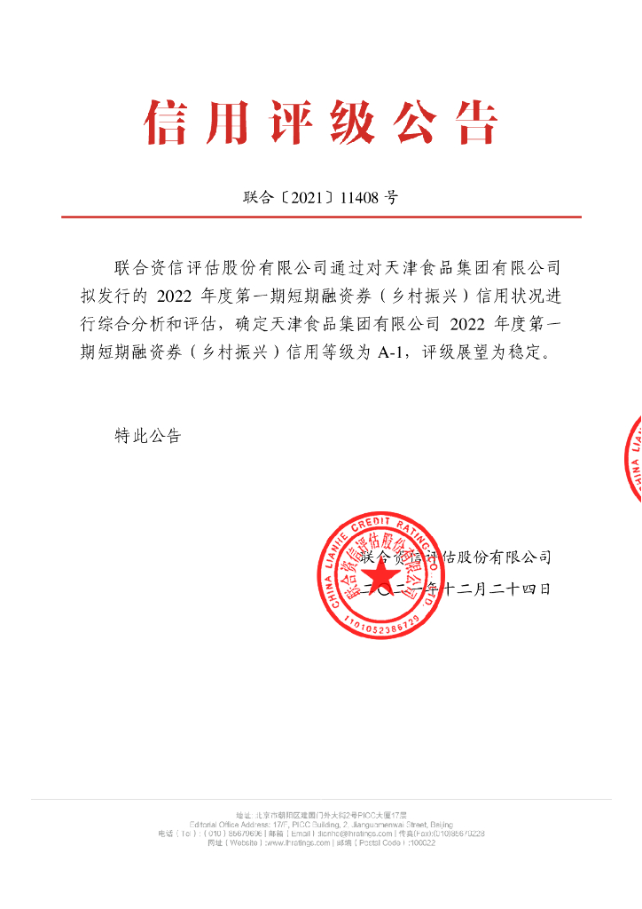 联合资信:天津食品集团有限公司2022年度第一期短期融资券(乡村振兴)信用评级报告.pdf