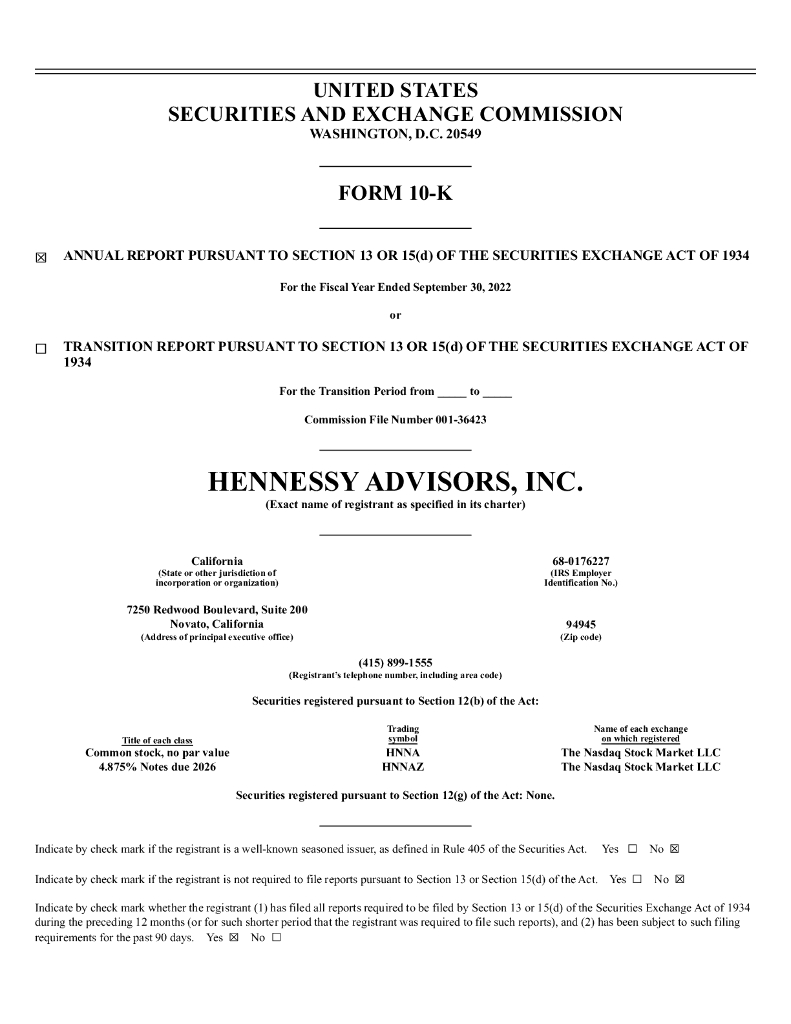 Hennessy Advisors, Inc.(HNNA)2022财年年度报告(英文版).pdf