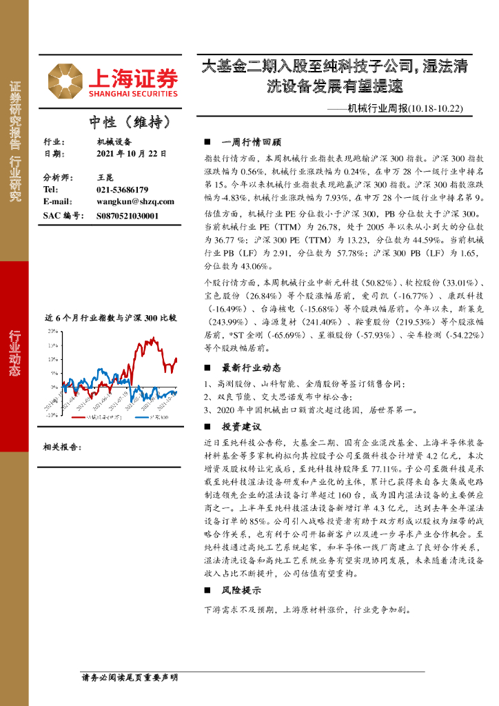 上海证券:机械行业周报:大基金二期入股至纯科技子公司,湿法清洗设备发展有望提速.pdf