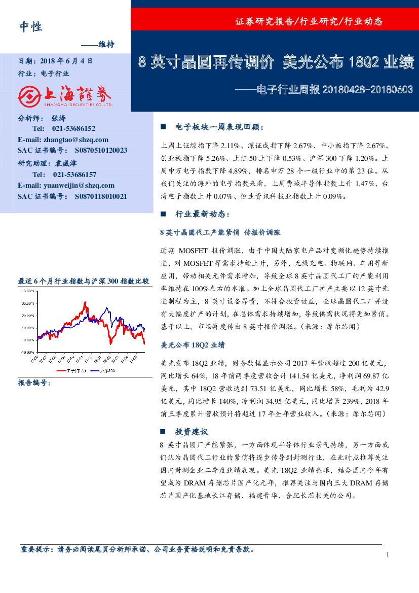 上海证券:电子行业周报:8英寸晶圆再传调价 美光公布18Q2业绩.pdf