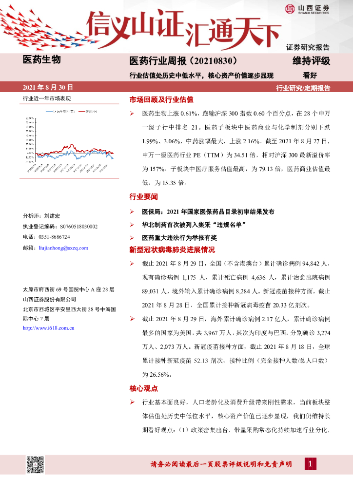山西证券:医药行业周报:行业估值处历史中低水平, 核心资产价值逐步显现.pdf