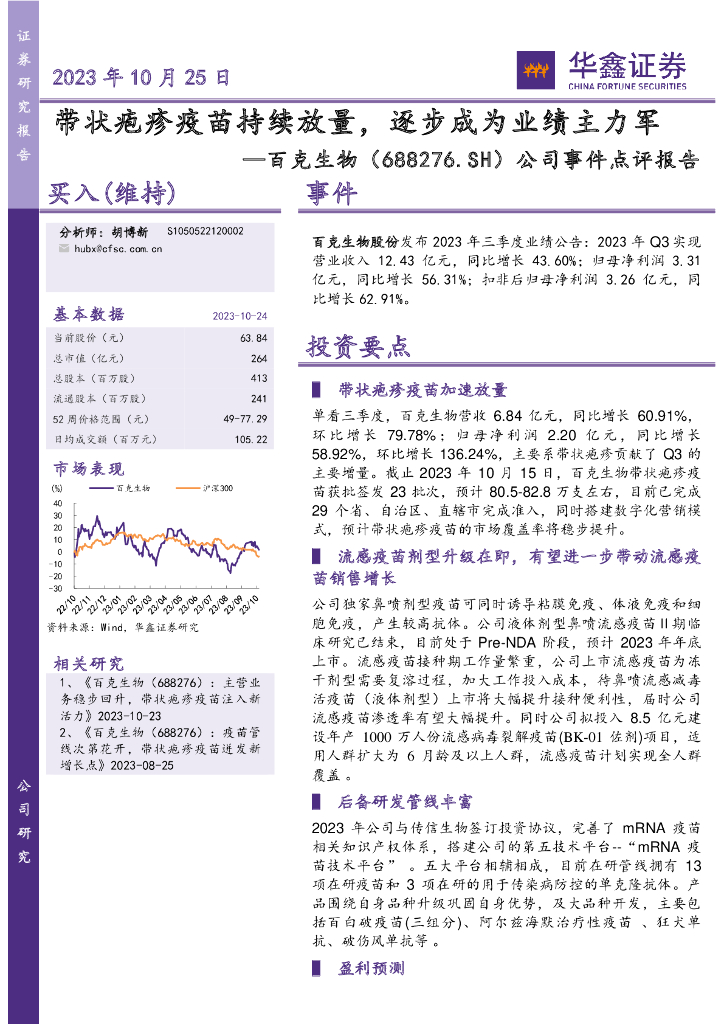 华鑫证券:百克生物(688276)-公司事件点评报告:带状疱疹疫苗持续放量,逐步成为业绩主力军.pdf