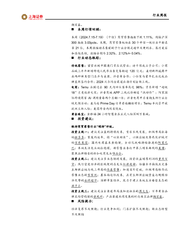 上海证券:商贸零售行业周报:24H1社零同比增长3.7%,6月增速趋缓.pdf