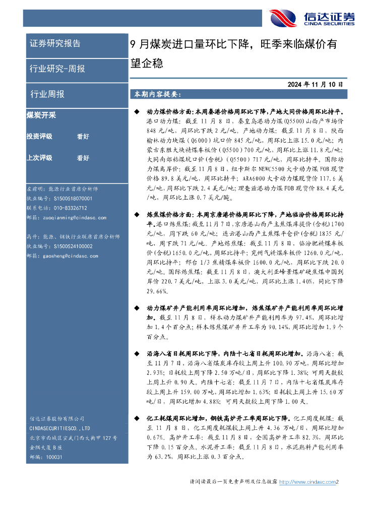 信达证券:9月煤炭进口量环比下降,旺季来临煤价有望企稳.pdf
