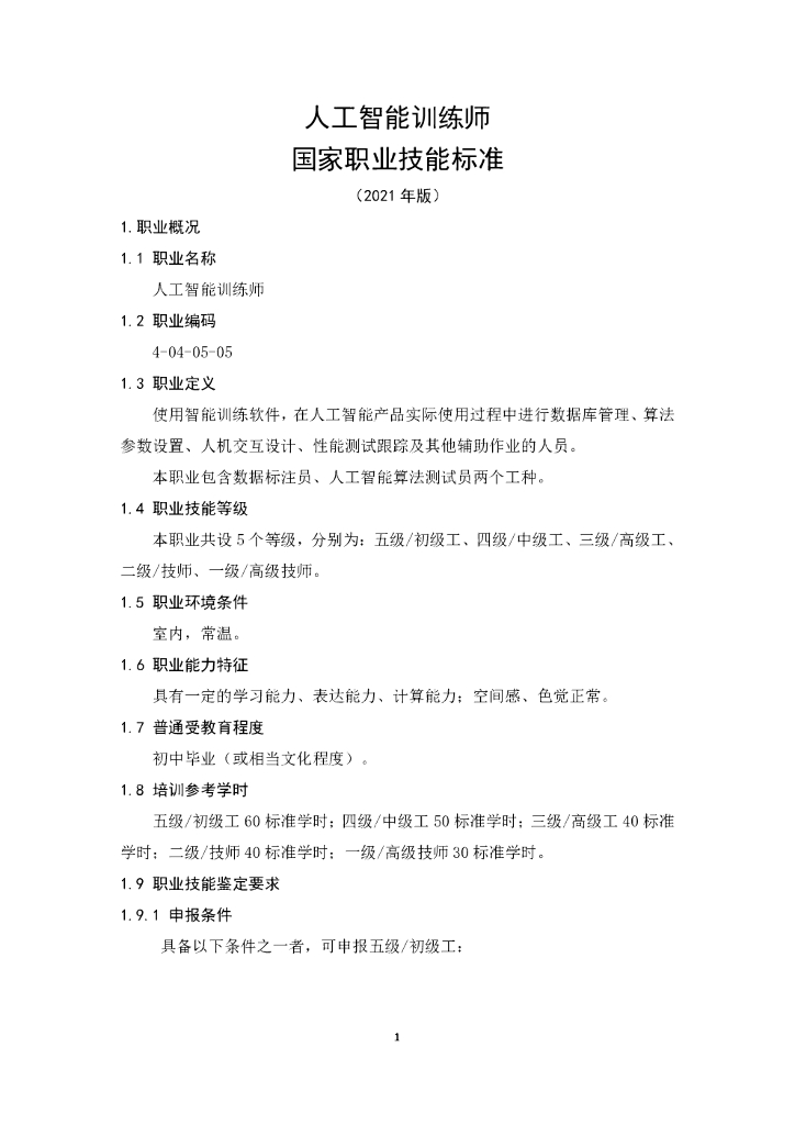 人力资源和社会保障部:人工智能训练师国家职业技能标准(2021年版).pdf