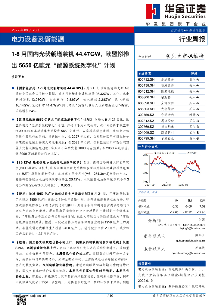 华金证券:电力设备及新能源行业周报:1-8月国内光伏新增装机44.47GW,欧盟拟推出5650亿欧元“能源系统数字化”计划.pdf