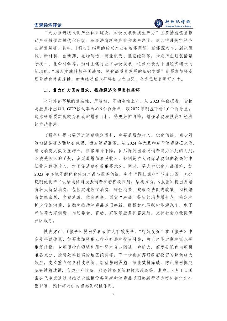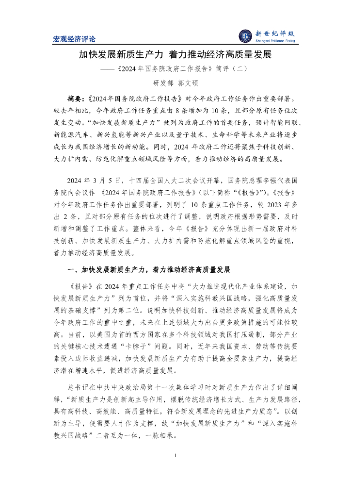 新世纪评级:加快发展新质生产力 着力推动经济高质量发展——《2024年国务院政府工作报告》简评(二).pdf
