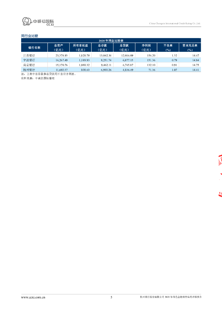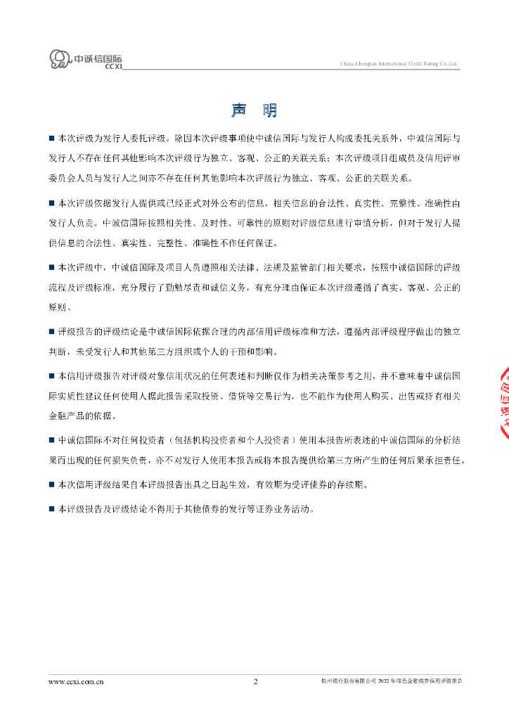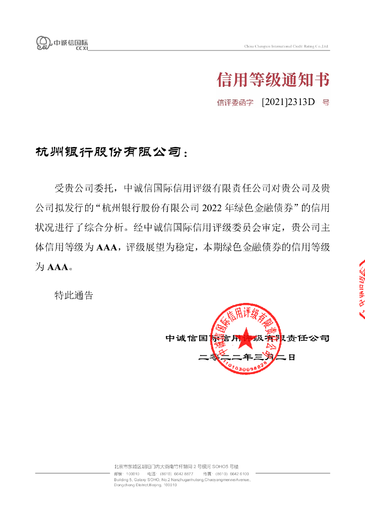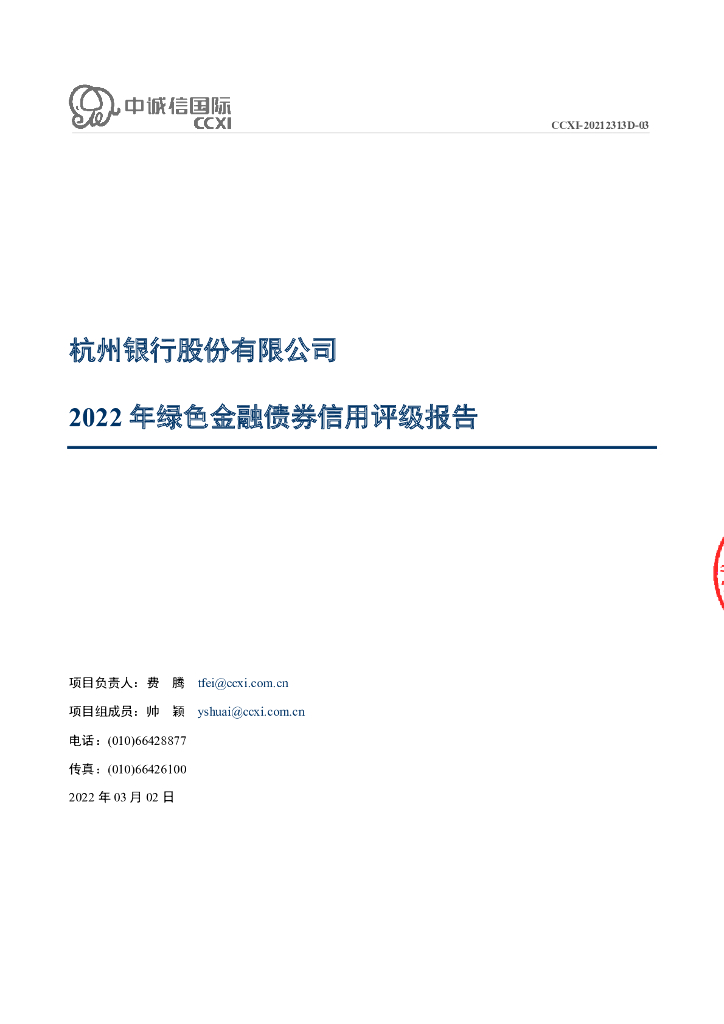 中诚信:杭州银行股份有限公司2022年绿色金融债券信用评级报告及跟踪评级安排.pdf