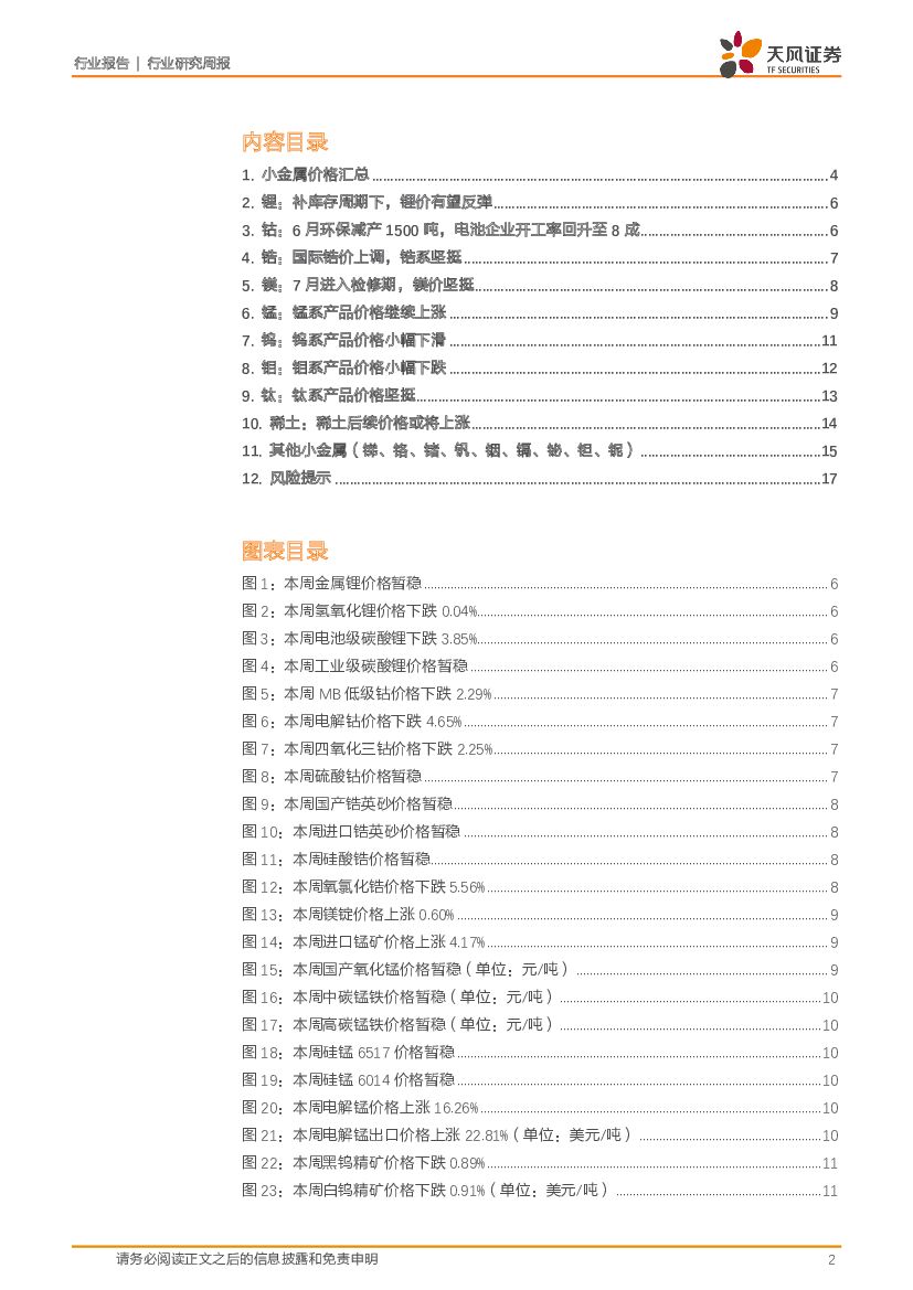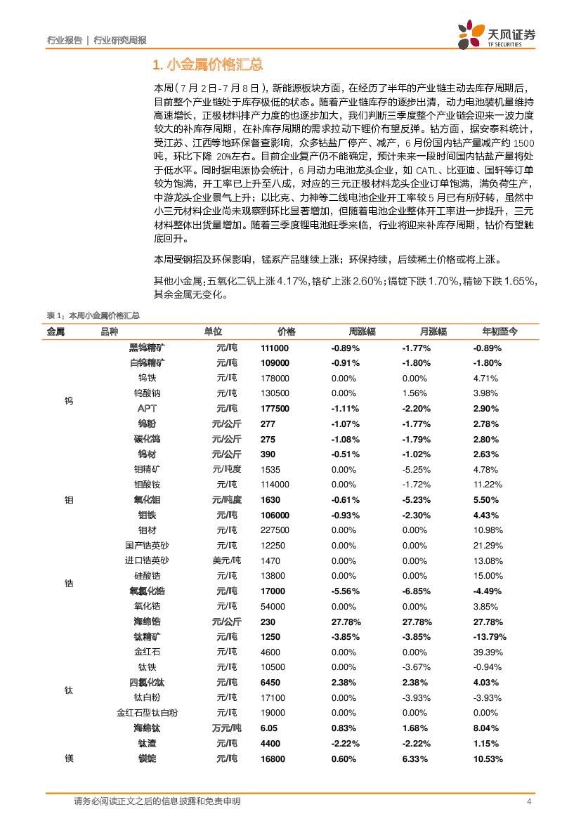 天风证券:小金属周报:6月环保导致钴盐产量下滑1500吨,电池企业开工率回升至8成.pdf