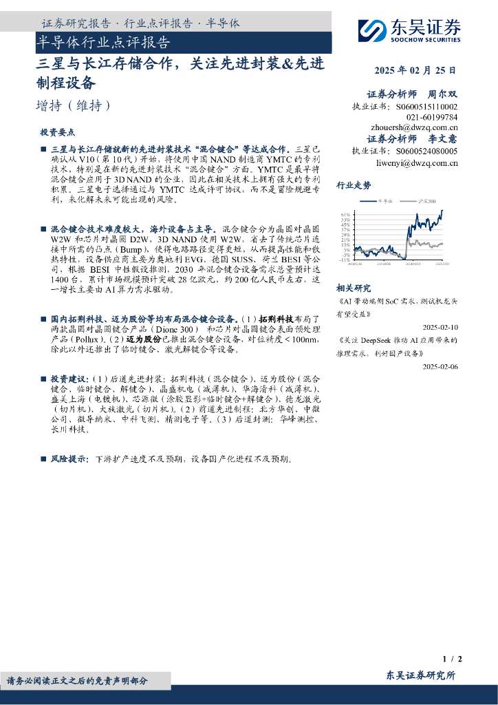东吴证券:半导体行业点评报告:三星与长江存储合作,关注先进封装&先进制程设备.pdf