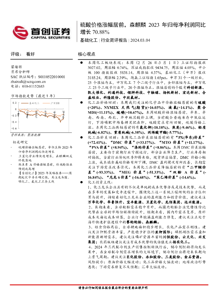 首创证券:基础化工行业简评报告:硫酸价格涨幅居前,森麒麟2023年归母净利润同比增长70.88%.pdf