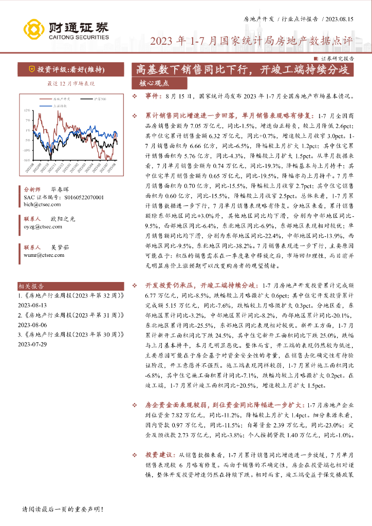 财通证券:房地产开发行业2023年1-7月国家统计局房地产数据点评:高基数下销售同比下行,开竣工端持续分歧.pdf