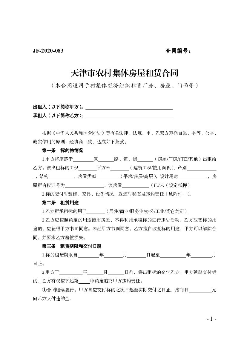 JF-2020-083 天津市农村集体房屋租赁合同(本合同适用于村集体经济组织租赁厂房、房屋、门面等).pdf