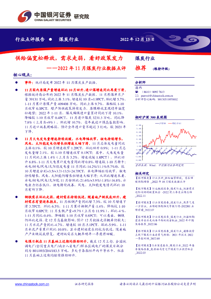 中国银河:2022年11月煤炭行业数据点评:供给偏宽松释放,需求走弱,看好政策发力.pdf