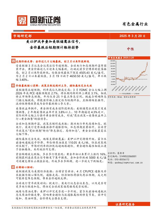 国新证券股份:有色金属行业:美以伊战争叠加美联储鹰派信号,金价暴跌后短期预计维持弱势.pdf