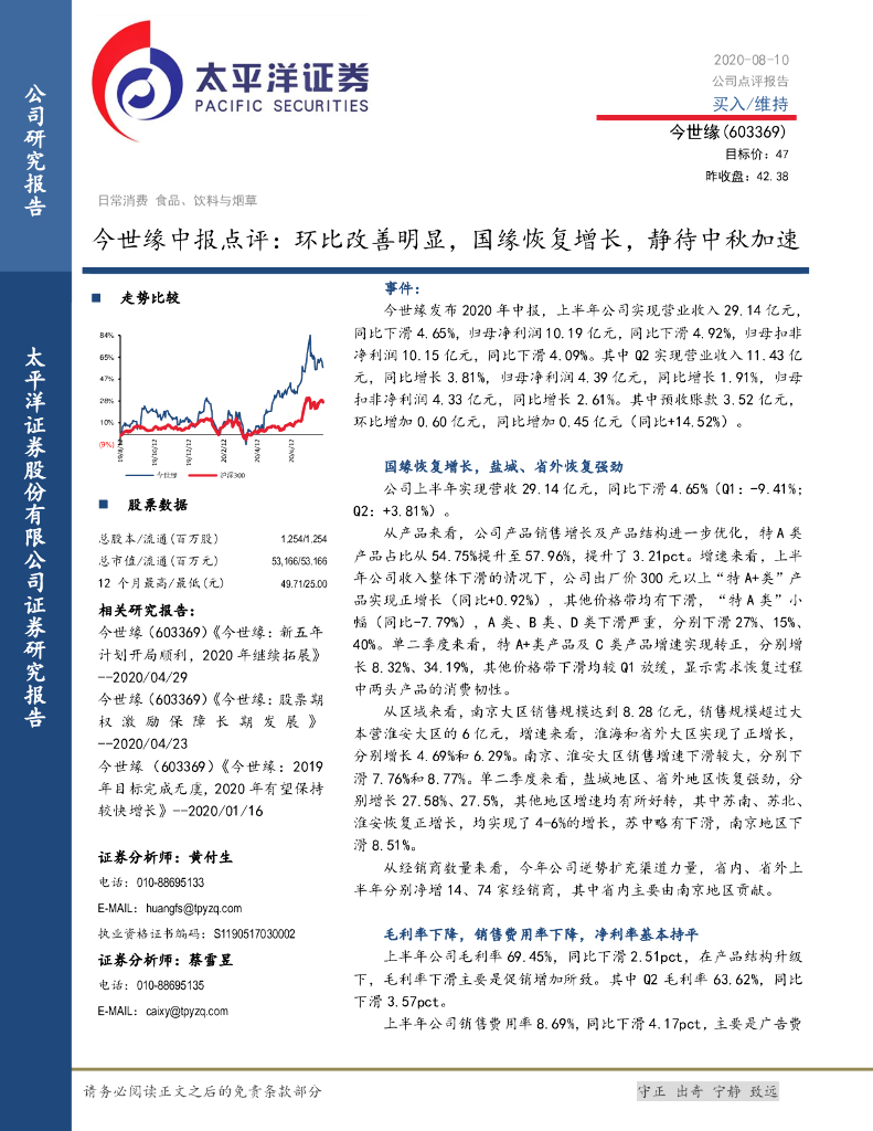 太平洋证券:今世缘中报点评:环比改善明显,国缘恢复增长,静待中秋加速.pdf