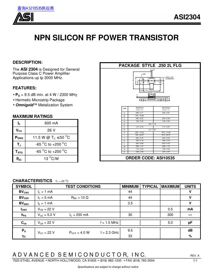 ASI ASI2304 NPN SILICON RF POWER TRANSISTOR 数据手册.pdf