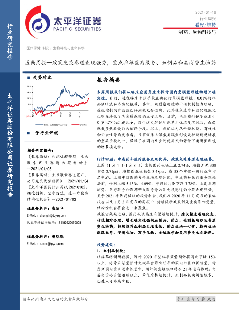 太平洋证券:医药周报:政策免疫赛道表现强势,重点推荐医疗服务、血制品和类消费生物药.pdf