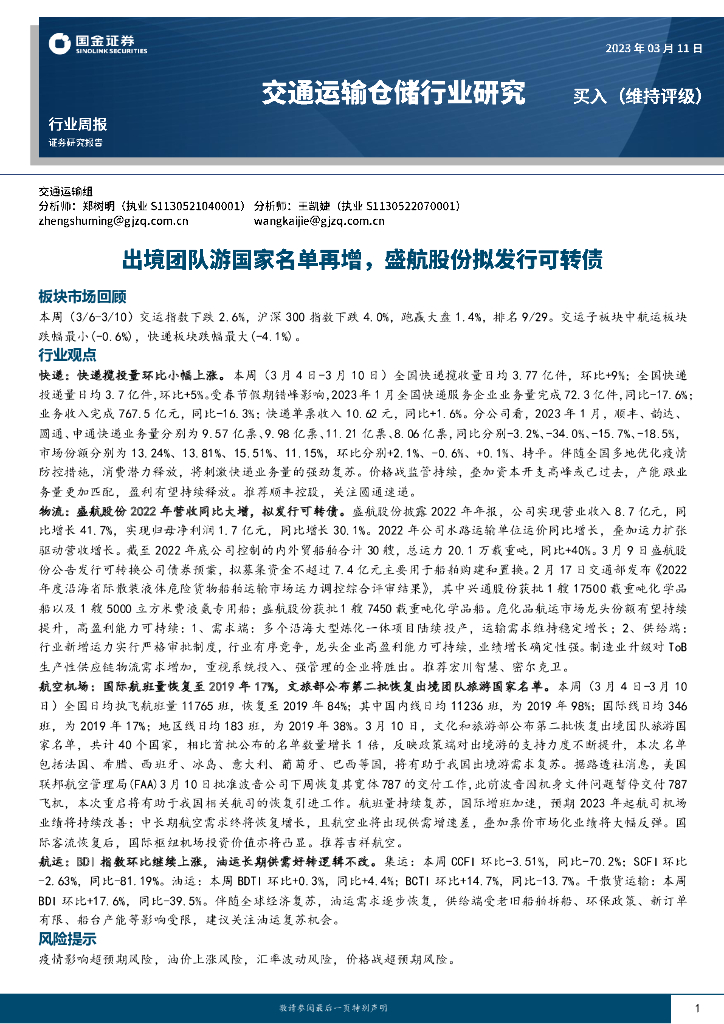 国金证券:交通运输仓储行业研究周报:出境团队游国家名单再增,盛航股份拟发行可转债.pdf