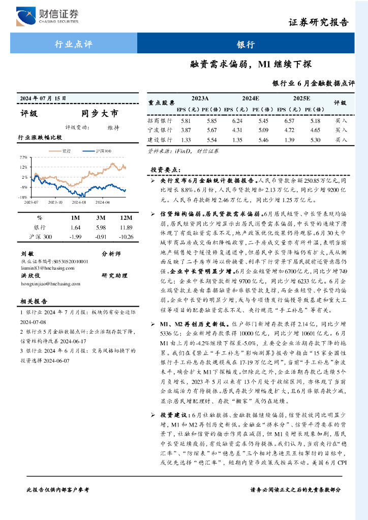 财信证券:银行业6月金融数据点评:融资需求偏弱,M1继续下探.pdf