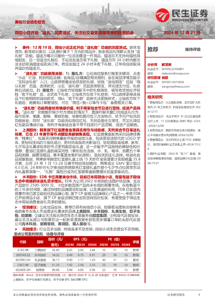 民生证券:美妆行业动态报告:微信小店开启“送礼”灰度测试,关注社交裂变浪潮带来的投资机会.pdf