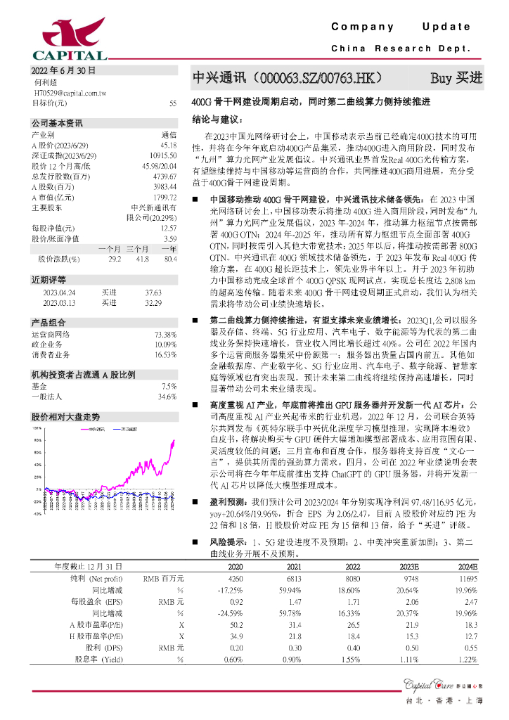群益证券:中兴通讯(000063)-400G骨干网建设周期启动,同时第二曲线算力侧持续推进.pdf